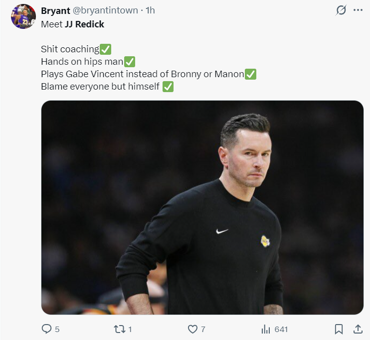 湖人球迷对雷迪克的评价很中肯:糟糕的执教、习惯性叉腰,把责任推给所有人,但把错误归咎给自己。